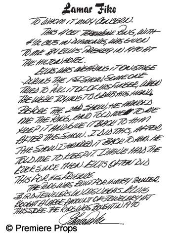 Elvis Presley 4ct. Tourmaline stone ring with 4 1/2 carats in diamonds ring - need appraisal - This unique ring was given to Lamar Fike by Elvis Presley in 1970 at The Hilton Hotel. Elivs was wearing it on stage during the first show when someone tried to pull it off his finger while grabbing his hand. Before the 2nd show, he handed Lamar Fike the ring to keep and give back to him after the show. However, after the show, when Lamar handed the ring back to Elvis, he told him to keep it. Lamar has had it ever since then. This was something Elvis commonly did for his friends. The ring was created for him by Thunderbird Jewelers in Las Vegas and purchased in 1970. Elvis purchased a large amount of his jewelry from Thunderbird. This ring comes with a letter of appraisal and a signed letter of its history by Lamar Fike. Lamar Fike was part of the "Memphis Mafia". Lamar Fike was larger-than-life figure member of the Elvis’ entourage. He worked lighting while Elvis appeared in Vegas and took care of the King’s transport needs. Elvis' nickname for Fike was Buddha and first met Elvis by just hanging out in front of Elvis' Audubon Drive home until finally invited by Elvis mother Gladys. Own a true piece of history from the King Of Rock And Roll. (PDA2000)