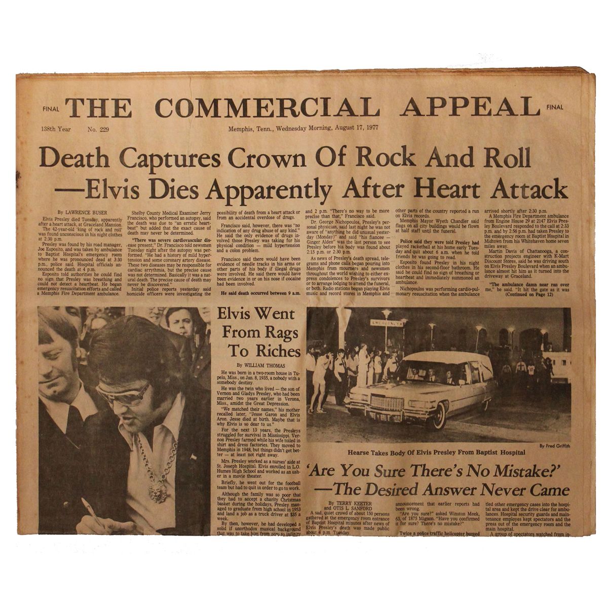 Special edition of Memphis newspaper ''The Commercial Appeal'' with reprinted articles related to the 16 August 1977 death of Elvis Presley that range in date from 16 to 21 August 1977. Articles in the 12 page edition record local reaction, details of Elvis' death, and photos of mourners and the funeral procession. Newspaper, published shortly after 21 August, measures 14.25'' x 23.5'' unfolded and 14.25'' x 11.75'' folded with moderate foxing and wear. Good condition.