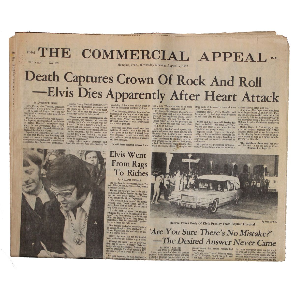 Twelve page special edition of the Memphis newspaper ''The Commercial Appeal'' with reprinted articles related to the 16 August 1977 death of Elvis Presley that range in date from 16 to 21 August 1977. Articles cover details of Elvis' death, local reaction and photos of mourners and the funeral procession. Newspaper, published shortly after 21 August, measures 14.25'' x 23.5'' unfolded and 14.25'' x 11.75'' folded with moderate toning and wear. Very good condition.