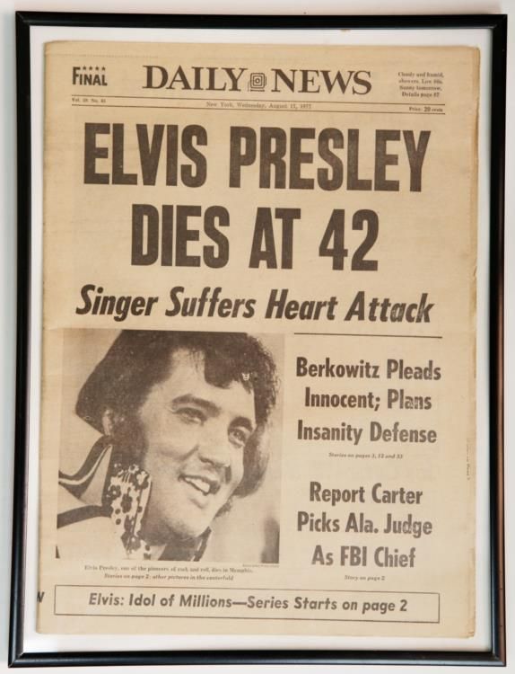 We present you with a framed front page newspaper headline from the Daily News (New York), "Elvis Presley Dies at 42," published August 17, 1977. This clipping is mounted in a 12" x 16" black frame and comes from an estate collection. This tragic headline in rock 'n roll history will be publicized for millennia to come.
