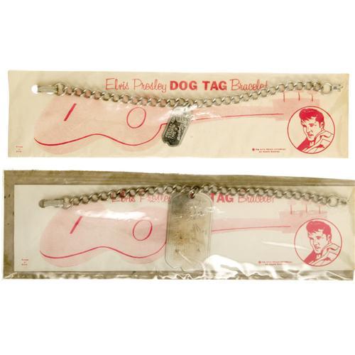 <B>Elvis Presley Dog Tag Bracelets.</B></I> A pair of stainless steel bracelets one with a large and one with a small dog tag charm featuring a tiny sketch of Elvis, reproduction of his signature, blood type, and U.S. Army serial number (type O and 53310761, in case you're wondering). Both are in Very Fine condition with a little tarnishing and still mounted on the original cardstock backing, which show very minor wear and tanning.<BR><BR><b>Shipping:</b> Flat Material, Small (<a target="_blank" href="http://www.heritageauctions.com/common/shipping.php">view shipping information</a>)