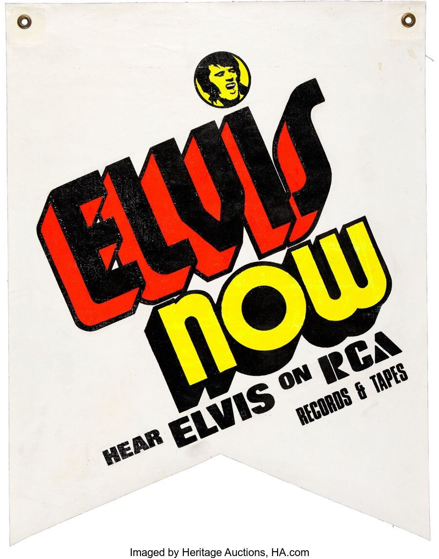 Elvis PresleyElvis NowPromo Banner. A vibrant banner made for promotion of Elvis' 1972 album, which features "Hey Jude" and "Put Your Hand in the Hand." Has two holes for display purposes. Measures approx. 23 ¼" x 30". In Very Good condition with soiling in various spots. COA from Heritage Auctions.