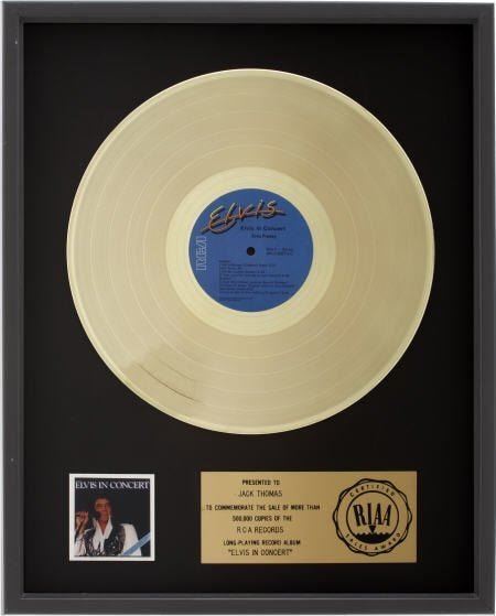 Presented to Jack Thomas (production engineer) to commemorate the sale of more than 500,000 copies of the 1977 soundtrack LP released in conjunction with the TV special of the same which featured some of Elvis' final performances.