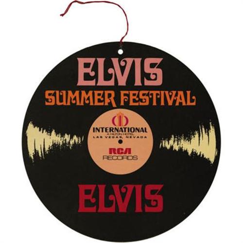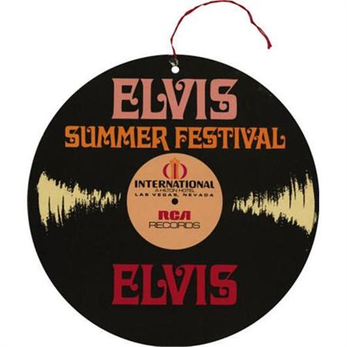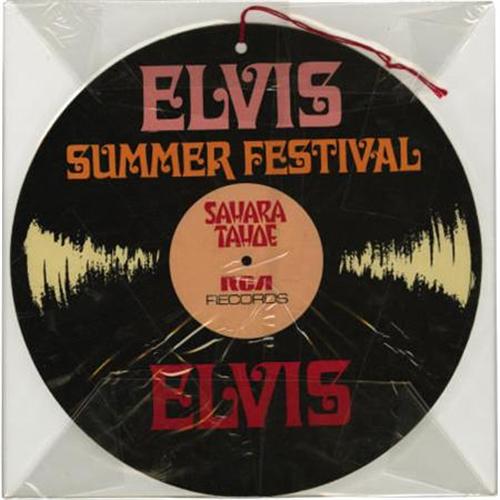 <B>Elvis Presley Engagement Mobile Group of 2 (c. 1970).</B></I> These two-sided mobiles were used during Elvis' "SUMMER FESTIVAL"s at the International Hotel in Las Vegas and at the Sahara Tahoe. Identical styles, record-shaped and 10.5" in diameter, with strings still attached for hanging. Both are in NM- condition.<BR><BR><b>Shipping:</b> Flat Material, Small (<a target="_blank" href="http://www.heritageauctions.com/common/shipping.php">view shipping information</a>)