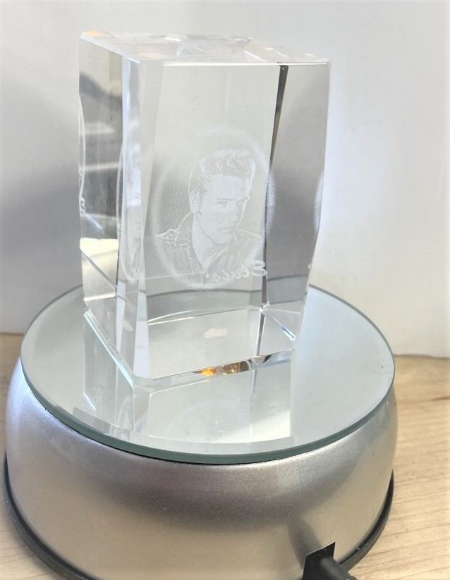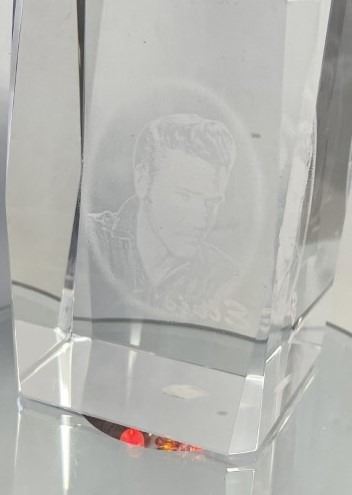 Elvis Presley Etched Crystal Glass Cube Paperweight w/Light Base