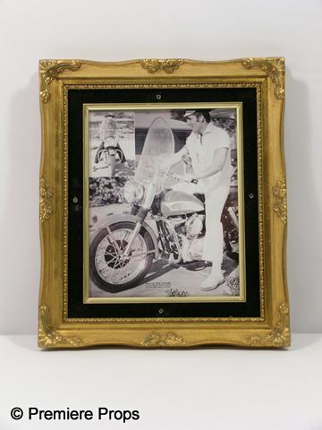 Elvis Presley black and white photo of him riding a motorcycle framed in a gold color wood frame. (approx. 14 1/2" x 12 1/2")