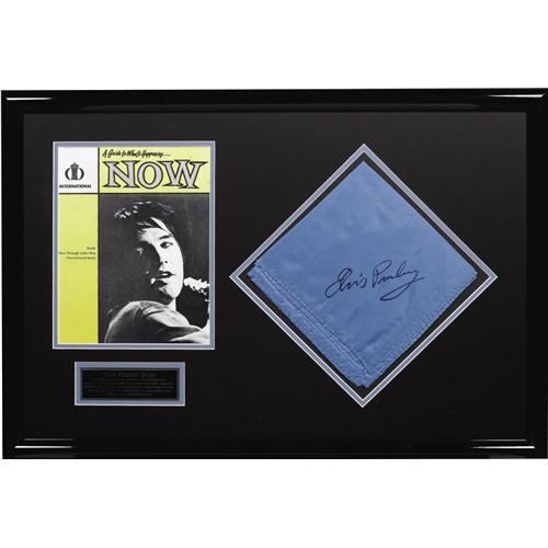 <B>Elvis Presley Framed Scarf.</B></I> A light blue scarf with a silk-screened image of Elvis' signature on it, one of many that Presley would wear and eventually throwing to his screaming fans during his concerts. In Excellent condition, matted and framed along with an issue of <I>Now</B></I> magazine with him on the cover, to an overall size of 29" x 20".<BR><BR><b>Shipping:</b> Framed - with Glass, Medium (<a target="_blank" href="http://www.heritageauctions.com/common/shipping.php">view shipping information</a>) <BR><BR><B>Important notic