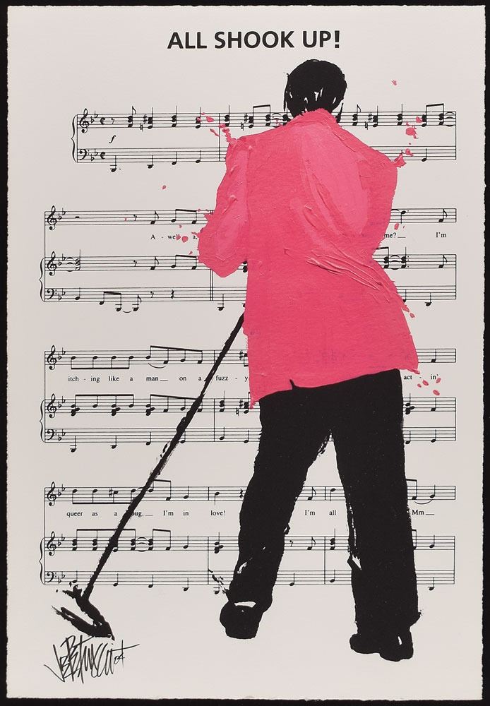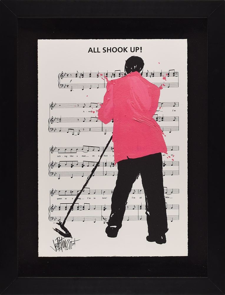 Highly appealing color 14 x 20.25 giclee print by rock and roll artist Joe Petruccio, entitled 'All Shook Up,' which depicts a full-length image of Elvis Presley facing sheet music for his 1957 hit single. Signed in the lower left in black felt tip by the artist. Mounted and archivally framed to an overall size of 21 x 27.25. In very fine condition.