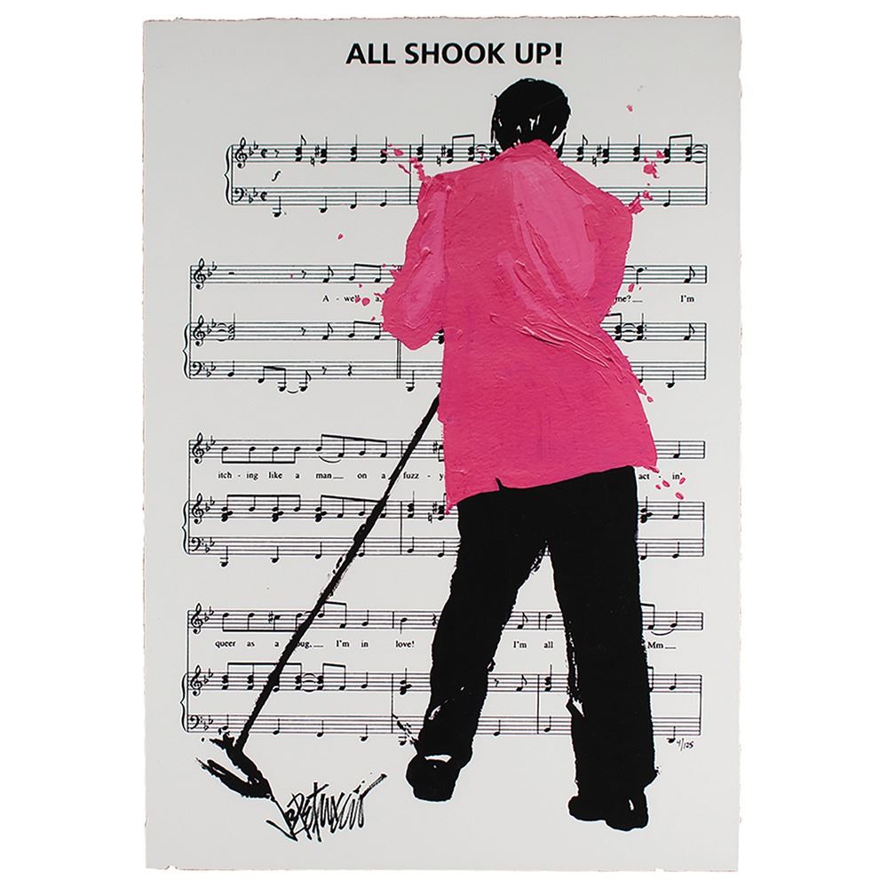 Highly appealing limited edition color 14 x 20 giclee print entitled 'All Shook Up' by rock and roll artist Joe Petruccio, numbered 4/125, which depicts a full-length image of Elvis Presley facing sheet music for his 1957 hit single. Signed in the lower left in black felt tip by the artist. In fine condition.