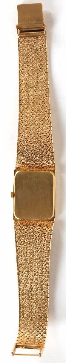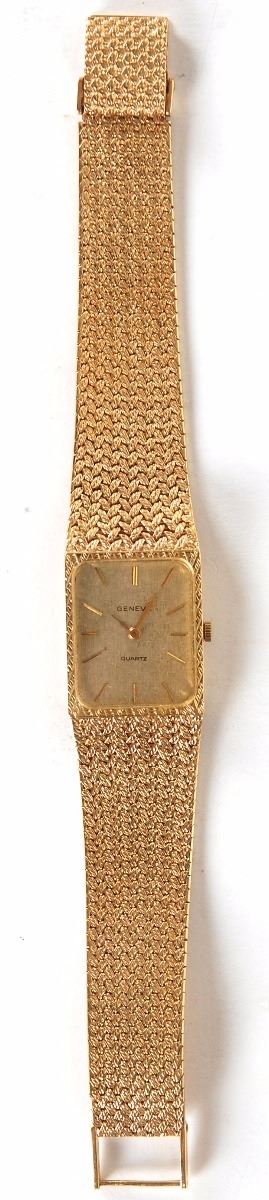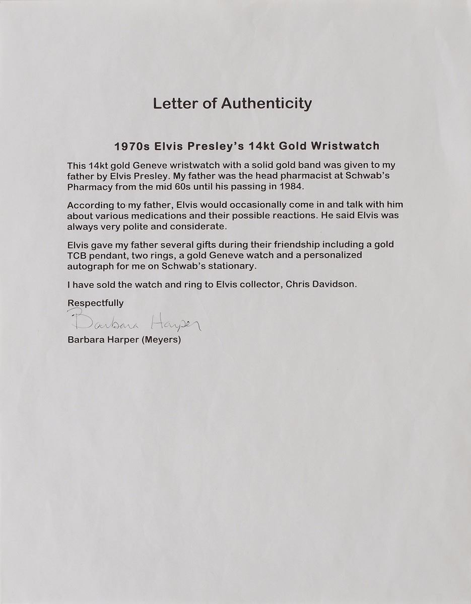Remarkable 14k gold Geneve Quartz wristwatch, measuring approximately 1 x 7.5, with a rectangular face and solid gold mesh band, gifted by Elvis Presley to the head pharmacist at Schwab’s Pharmacy in Hollywood, California. In fine condition. Accompanied by a letter of provenance from the daughter of the original recipient, in full: “This 14kt gold Geneve wristwatch with a solid gold band was given to my father by Elvis Presley. My father was the head pharmacist at Schwab’s Pharmacy from the mid 60s until his passing in 1984. According to my father, Elvis would occasionally come in and talk with him about various medications and their possible reactions. He said Elvis was always very polite and considerate. Elvis gave my father several gifts during their friendship.” A uniquely lavish present with exceptional provenance, this stunning watch exists as yet another instance of the King’s well-documented generosity.