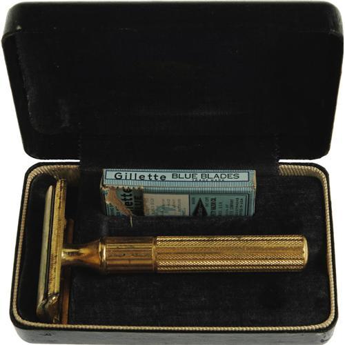 <B>Elvis Presley Gold Tone Travel Razor Kit.</B></I> A gold tone Gillette safety razor with a black clamshell carrying box and small travel pack of Gillette Blue razor blades (three of which are inside, still sealed in their individual wrappers). In Fine to Very Fine condition with moderate wear to the case and some mild to moderate tarnishing to the razor. <I>From the Ann Sothern Collection.</B></I><I>Accompanied by LOA from LA Prop & Wardrobe Company.</B></I><BR><BR><b>Shipping:</b> Miscellaneous Collectibles, Smal (<a target="_blank" href="http://www.heritageauctions.com/common/shipping.php">view shipping information</a>)