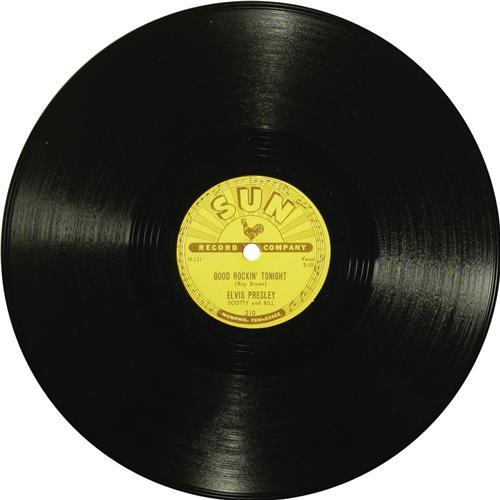 <B>Elvis Presley "Good Rockin' Tonight"/ "I Don't Care If The Sun Don't Shine" 78 Sun 210 (1955).</B></I> Rarer version of a scarce 78 credits "Scotty and Bill" in addition to Elvis on the record labels. The second Sun release for The King, Side A was written by R&B great Roy Brown who charted his own version in 1948, peaking at #11 on Billboard's R&B charts. The record plays better than it looks, with no pops or clicks. Labels are nearly perfect. Condition: VG 5, plays VG-EX 6.