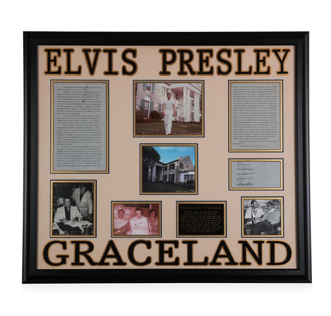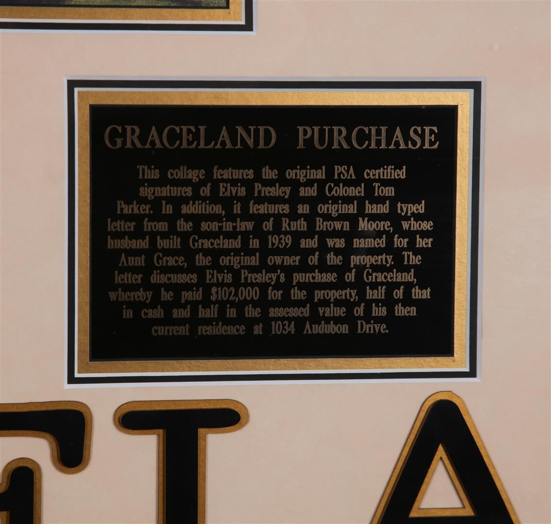 This collage features the original PSA certified signatures of Elvis Presley and Colonel Tom Parker. In addition, it features an original hand typed letter from the son-in-law of Ruth Brown Moore, whose husband built Graceland in 1939 and was named for her Aunt Grace, the original owner of the property. The letter discusses Elvis Presley's purchase of Graceland whereby he paid $102,000 for the property, half of that in cash and half in the assessed in the value of his then current residence at 1034 Audubon Drive. Framed 36" x 41"