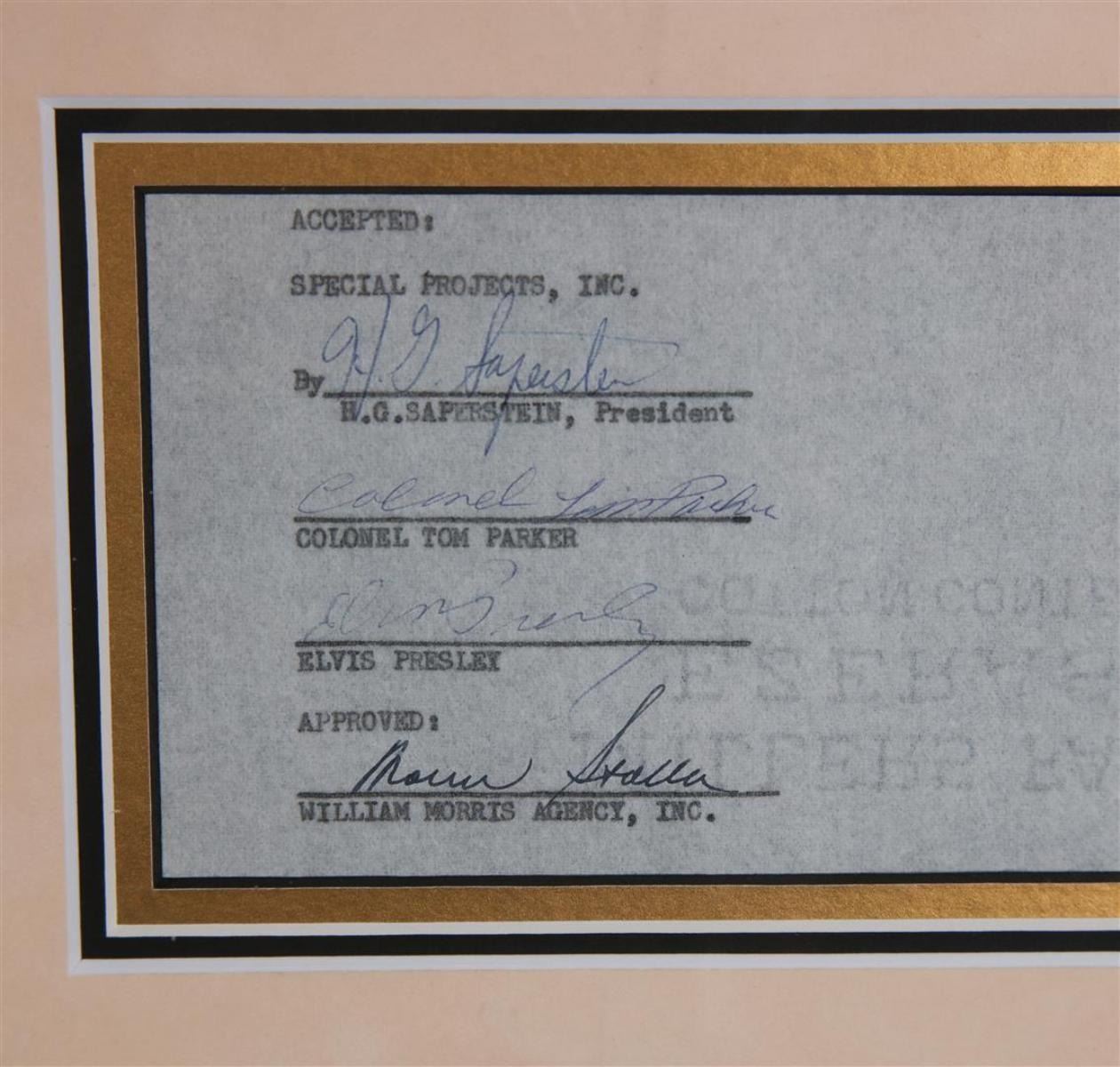 This collage features the original PSA certified signatures of Elvis Presley and Colonel Tom Parker. In addition, it features an original hand typed letter from the son-in-law of Ruth Brown Moore, whose husband built Graceland in 1939 and was named for her Aunt Grace, the original owner of the property. The letter discusses Elvis Presley's purchase of Graceland whereby he paid $102,000 for the property, half of that in cash and half in the assessed in the value of his then current residence at 1034 Audubon Drive. Framed 36" x 41"