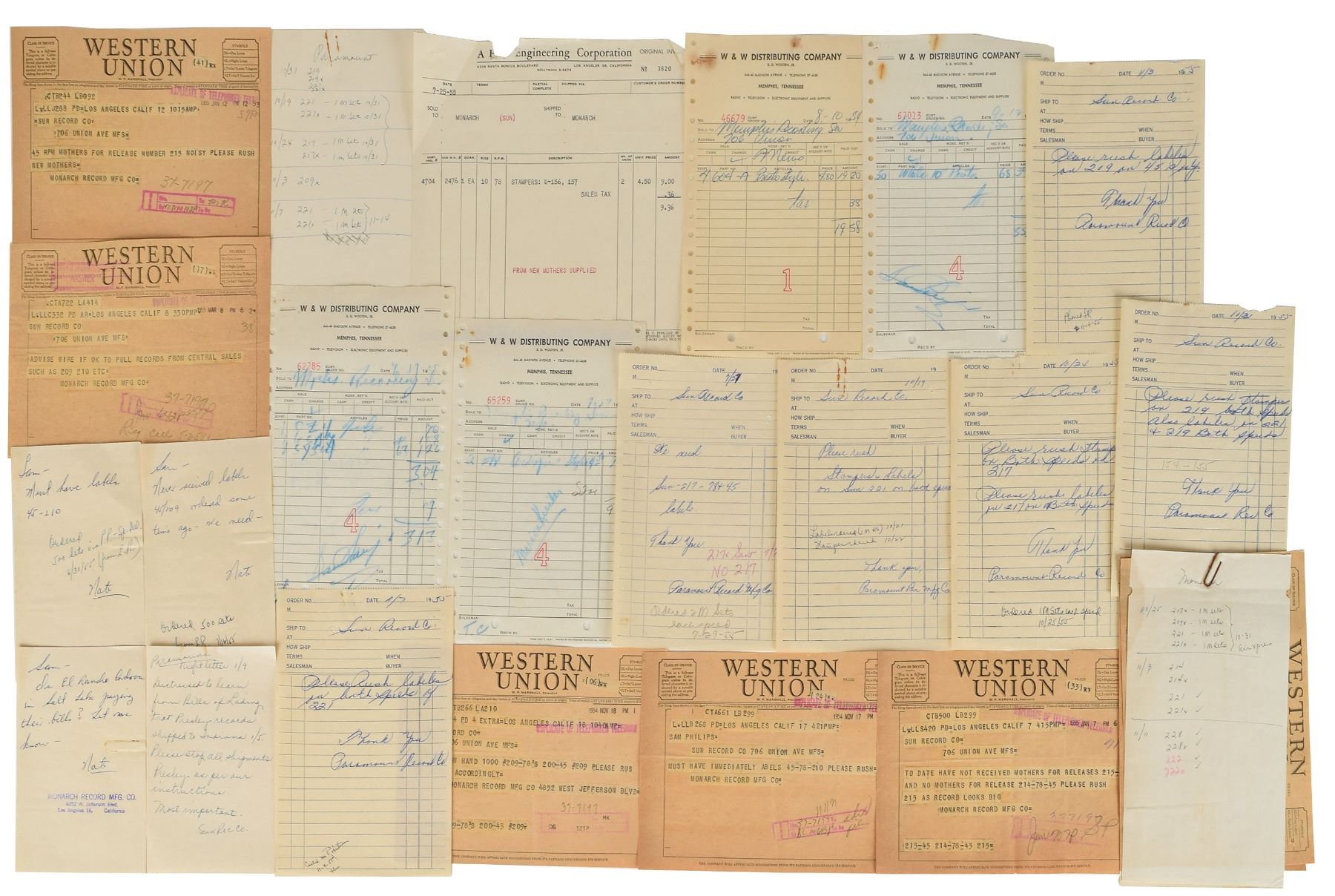Interesting collection of financial material relating to Elvis Presley’s early recording days with rock-and-roll pioneer Sam Phillips at Sun Studio (Memphis Recording Service). The collection includes: four W & W Distributing invoices, three of which are carbon copies, dated between August 1954 and September 1955, with two approved by Phillips, and one bearing the signature of Marion Keisker, who is best remembered as the first person to record Elvis Presley, on July 18, 1953; a group of six invoices issued to Sun Records by the Paramount Record Company, with each relating to “stamper” and “label” orders, dated between July and November 1955; a set of seven Western Union telegrams directed to Phillips and the Sun Record Company by the Monarch Record Manufacturing Company, with the majority requesting “Mothers” and “labels,” dated between November 1954 and November 1955; a set of three handwritten letters from Nate Duroff of Monarch Records, each addressed to Phillips; an invoice concerning the sale of 10 stampers to Monarch Records, dated July 25, 1955; and a handwritten note, unsigned, dated January 9, no year: in full: “Paramount, Night letter, Distressed to learn from Bills of Lading that Presley records shipped to Indiana 1/5. Please stop all shipments Presley as per our instructions. Most important. Sun Rec. Co.” In overall very good to fine condition.