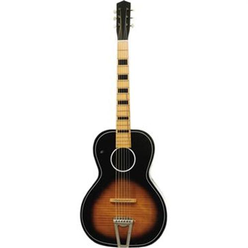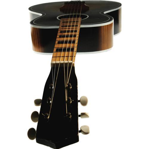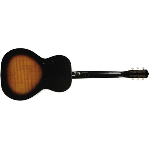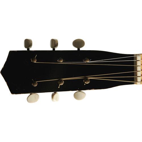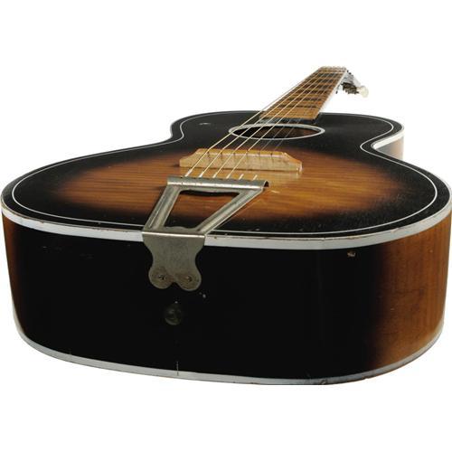 <B>Elvis Presley Owned and Used Guitar.</B></I> Owned and used by Elvis Presley, this Italian-made acoustic guitar was previously a crowd-pleaser at the Warner Bros. Museum in Hollywood. Its background offers a touching story: Elvis played this guitar as he sang the final song in <I>Follow That Dream</B></I> (1962), and another musician played it (Elvis at one point touches it) in <I>Kid Galahad</B></I> (1962). Elvis became friends with a prop man who worked on both films and presented him the guitar, and the prop man consequently gave it to his young son, who idolized "the King." The boy cherished this guitar until his premature death a few years ago, at which time his widow put the instrument on display at the Warner Bros. Museum. She has since decided to part with it, hoping the guitar will find a new owner who will appreciate its distinction as deeply as her husband did. This 3/4-style guitar, 38" long and in Very Fine condition aside from a minor "ding" about the size of a dime and approximately 2" from the upper-face edge. Accompanying the item is a black Gibson guitar case (not the original) with deep purple lining. A remarkably rare Elvis artifact that gives testimony to his talent, generosity, and the devotion he still inspires three decades after his death. {a href="/images/Elvis-FTDGuitar.wmv" target=_new}Watch Elvis playing this guitar.{/a}<BR><BR><b>Shipping:</b> Musical Instruments, Large (<a target="_blank" href="http://www.heritageauctions.com/common/shipping.php">view shipping information</a>)