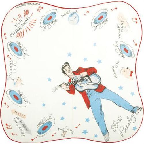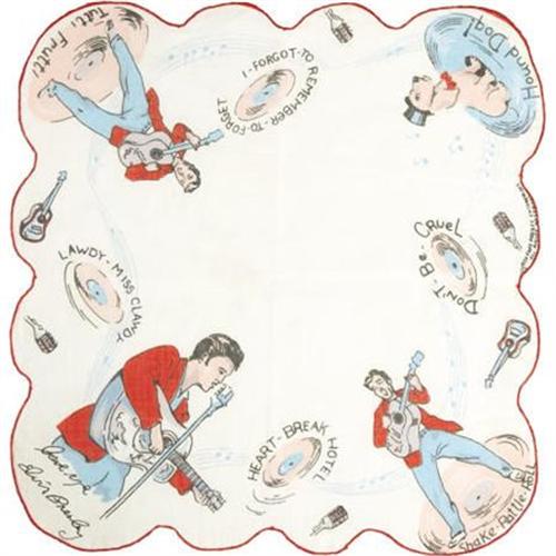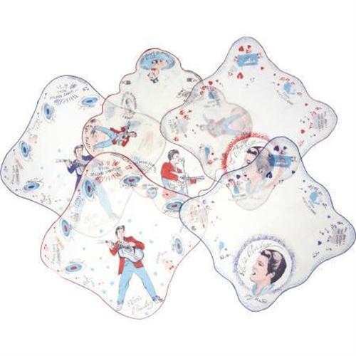 <B>Elvis Presley Handkerchief Set of 5 (Elvis Presley Enterprises, 1956).</B></I> At the height of Presley-mania, the magic year of 1956, Elvis Presley Enterprises issued this set of five handkerchiefs, each depicting its own distinct artwork and commemorating 5-7 hits of The King. It's rare to find these handkerchiefs offered as a complete set, so here's an uncommon opportunity to collect 'em all in one swell foop... or fell swoop, for that matter. Just get 'em! They're in excellent shape, with a minimum of staining from handling.<BR><BR><b>Shipping:</b> Flat Material, Small (<a target="_blank" href="http://www.heritageauctions.com/common/shipping.php">view shipping information</a>)