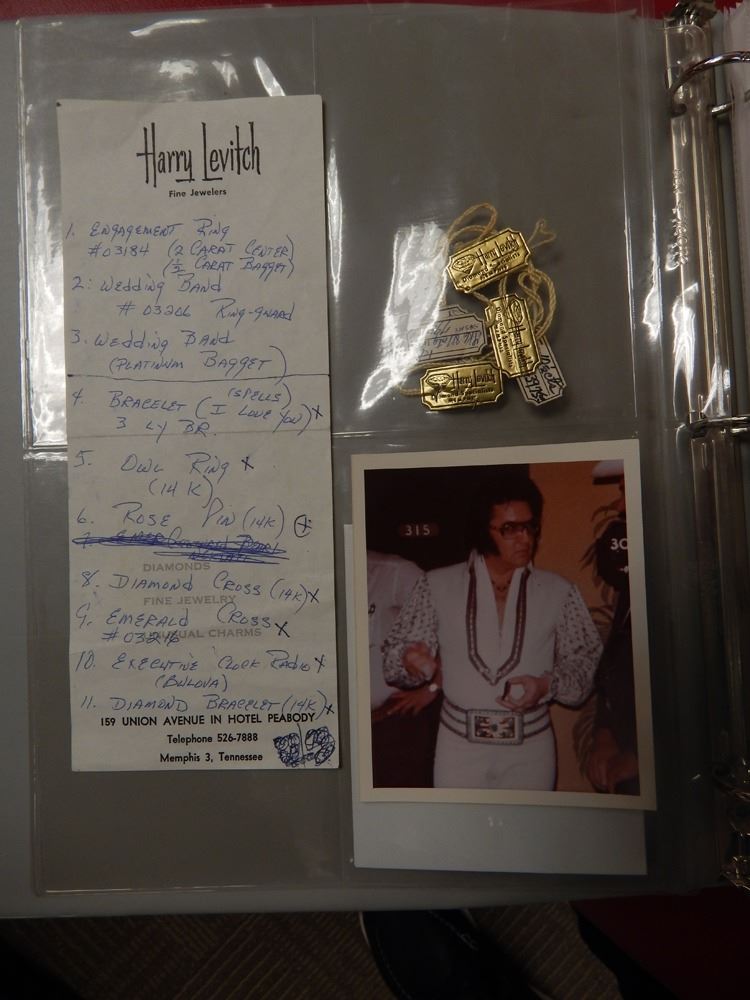 Set of six jewelry tags from Harry Levitch Fine Jewelers removed from pieces purchased and owned by Elvis Presley. The pieces are identified on the back of each tag and can be matched to a handwritten list provided on Harry Levitch letterhead and also comes with a letter from the jewelers. All items come with a certificate of authenticity good for the life of the piece.