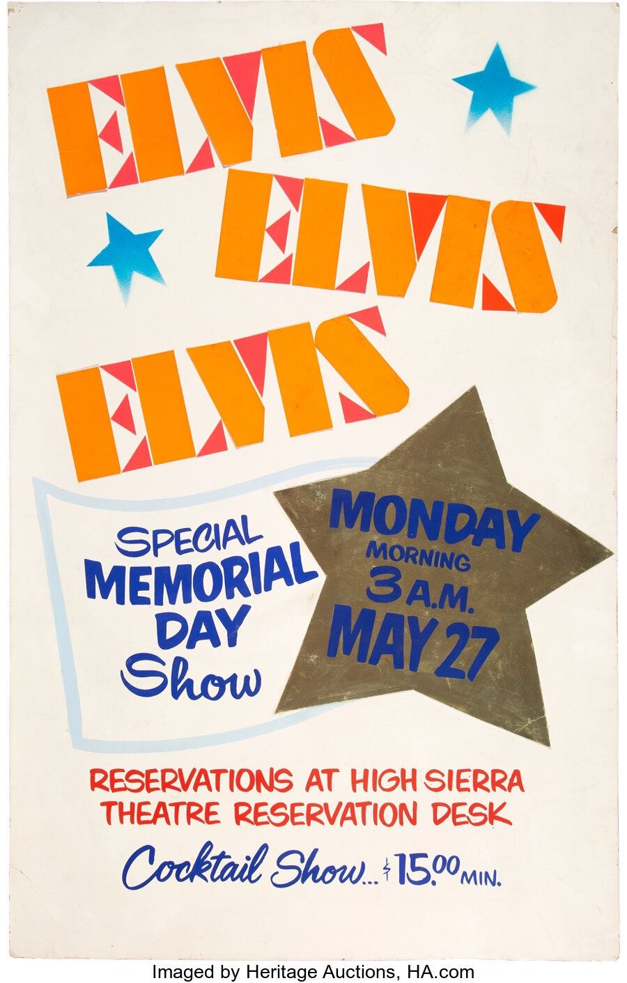 Elvis Presley High Sierra Cutout Stand-Up Promo Concert Poster (1974). A cardboard hand-made cutout stand-up promo poster for a "Special Memorial Day Show" featuring the King at 3 am on Monday, May 27. Has the letters and stars attached to the thin white backing board. Measures 28" x 44". In Very Good Plus condition with creasing throughout, along with a hole in the upper left corner. COA from Heritage Auctions.