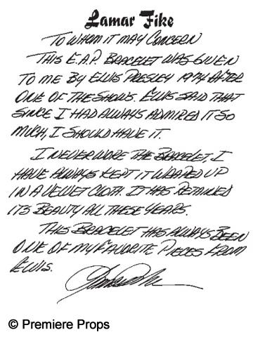 Elvis Presley Bracelet with initials: E.A.P. in diamonds - This very unique bracelet was given to Lamar Fike by Elvis Presley in 1974, after one of his shows. Elvis told Lamar to have it since he always admired it. The bracelet was never worn by anyone but Elvis and has been kept wrapped up in a velvet cloth to retain its beauty over the years. This bracelet comes with a letter written about the bracelet's history, signed by Lamar Fike. Lamar Fike was part of the "Memphis Mafia". Lamar Fike was larger-than-life figure member of the Elvis’ entourage. He worked lighting while Elvis appeared in Vegas and took care of the King’s transport needs. Elvis' nickname for Fike was Buddha and first met Elvis by just hanging out in front of Elvis' Audubon Drive home until finally invited by Elvis mother Gladys. This is definitely one to own worn only by the King himself and an invaluable piece of music history to own forever.(PDA2003)