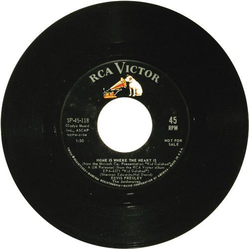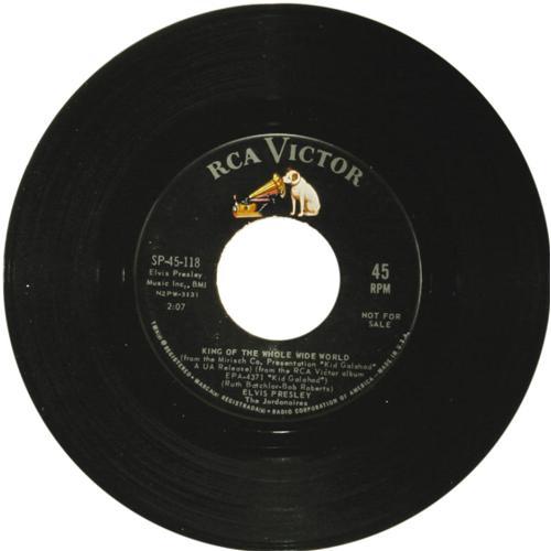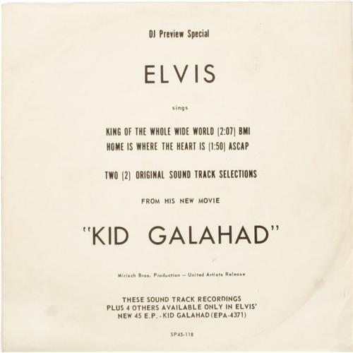 <B>Elvis Presley "Kid Galahad" Promo 45 w/Special Sleeve (RCA 118, 1962).</B></I> The sleeve, a "DJ Preview Special", indicates the two selections included ("King of the Whole Wide World" and "Home is Where the Heart is") plus 4 others are available only on Elvis' new 45 EP, "Kid Galahad". Condition: NM 8/ NM 8.<BR><BR><b>Shipping:</b> Recordings (<a target="_blank" href="http://www.heritageauctions.com/common/shipping.php">view shipping information</a>)