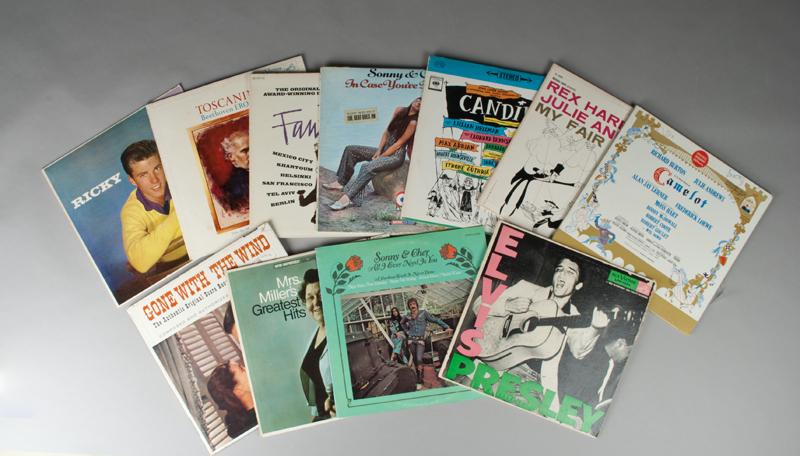 Elvis Presley RCA-Victor LPM-1254, from 1956, includes songs Blue Suede Shoes, Tutti Frutti, Blue Moon and more. Together with Sonny & Cher "All I Ever Need Is You," Mrs. Miller's "Greatest Hits," "Gone With The Wind," Richard Burton & Julie Andrews "Camelot," Rex Harrison and Julie Andrews "My Fair Lady," "Candide," Sonny & Cher "In Case You're In Love," "The Fantasticks," Tocanini "Beethoven Eroica," and Ricky Neslon "Ricky."