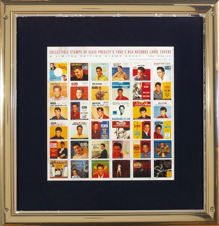 Two stamp sheets commemorating Elvis Presley and showing the sleeves for his RCA Victor releases through the 1950s and 1960s. Both individually framed as display items. Also with an Elvis 1977 'Welcome To My World' enlarged sleeve artwork issued for promotional reasons and an Elvis stamp release cover from Micronesia. All framed (4 items)