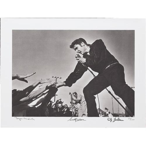<B>Elvis Presley Lithograph Signed by Scotty Moore and D.J. Fontana.</B></I> A 24" x 19" b&w lithogrpah of Elvis performing before an enthusiastic crowd, signed by Moore, Fontana, and an unknown third party in black ink, #266 in a limited edition of 1,000. In Excellent condition.<BR><BR><b>Shipping:</b> Flat Material, Large (<a target="_blank" href="http://www.heritageauctions.com/common/shipping.php">view shipping information</a>)