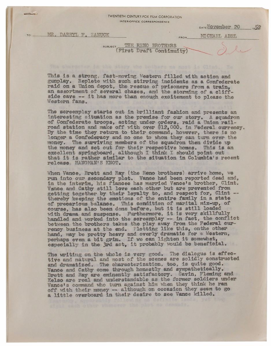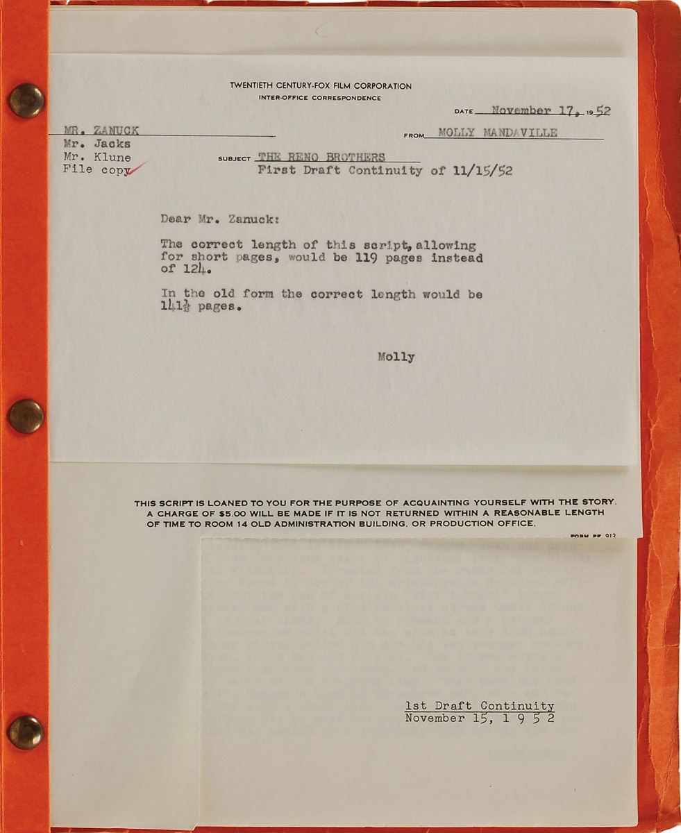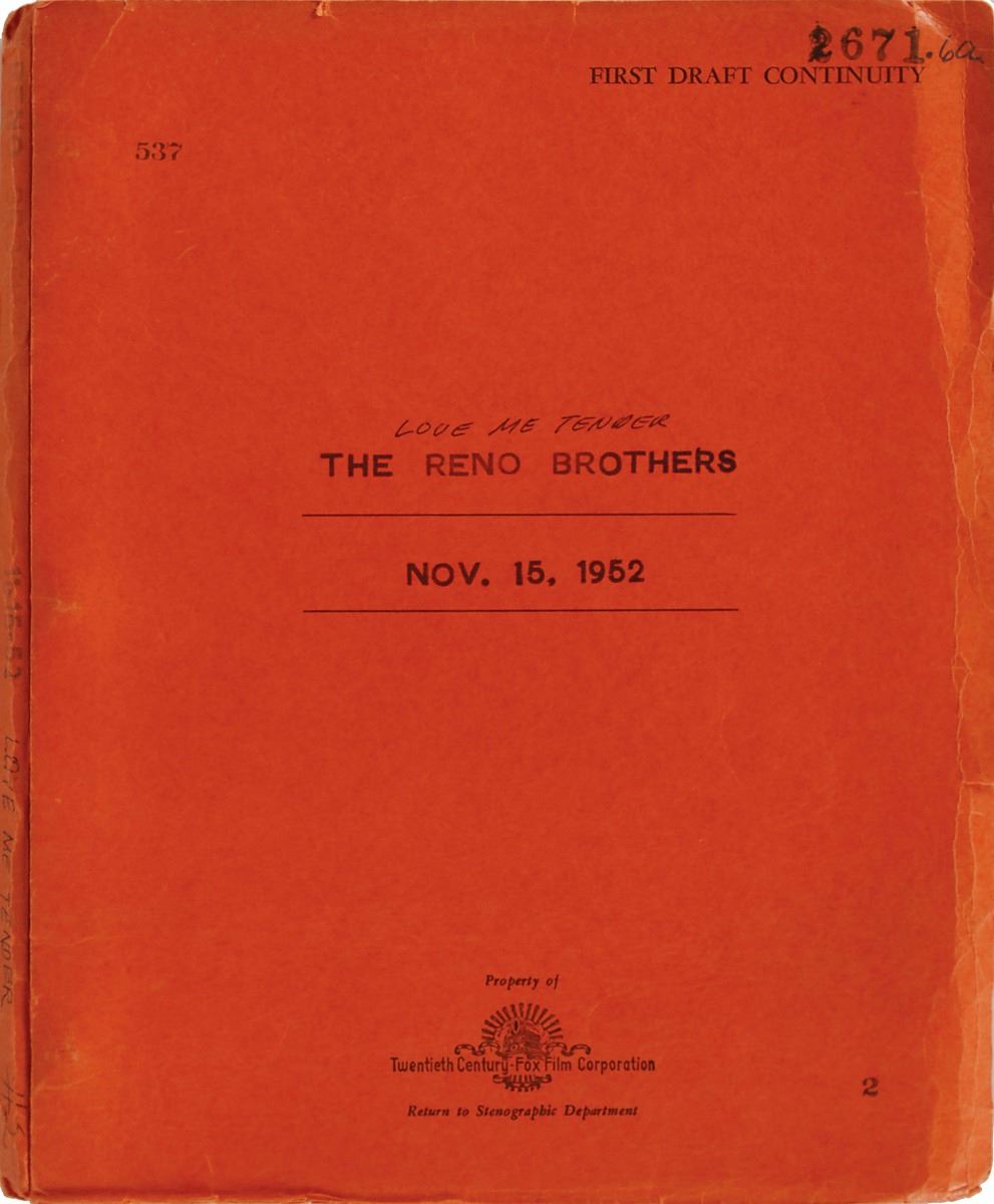 First draft continuity screenplay for the 20th Century Fox film “The Reno Brothers,” 9.5 x 11.5, 124 pages, dated November 17, 1952. Includes an inter office correspondence letter directed to Darryl F. Zanuck from his script coordinator Molly Mandaville, in full: “The correct length of this script, allowing for short pages, would be 119 pages instead of 124. In the old form the correct length would be 141 ½ pages.” The script bears numerous handwritten emendations, and is housed in its original orange 20th Century Fox folder, numbered “537.” In fine condition. Accompanied by two inter office correspondence letters concerning the script. Originally titled The Reno Brothers, the 1956 film Love Me Tender marked the acting debut of Elvis Presley; the name of the film was changed when advanced sales of Presley’s hit song exceeded one million in sales.
