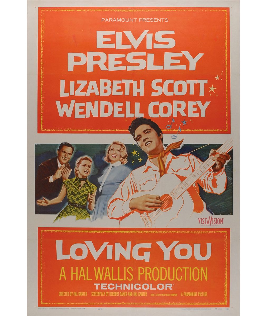 Original color 27 x 41 one-sheet movie poster for the 1957 Elvis film Loving You, starring Presley and Lizabeth Scott, featuring a colorful image of Presley playing a guitar. Poster has been professionally linen backed. Previous intersecting folds, some mild creasing along some of the folds, and a few trivial spots, otherwise fine condition. Rolled.