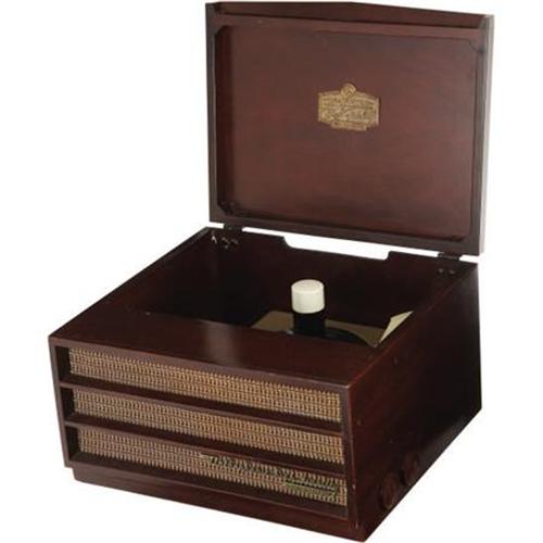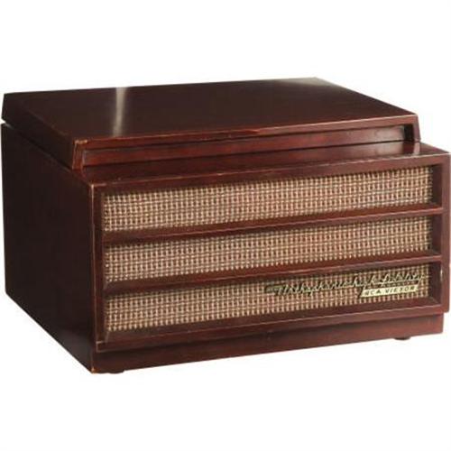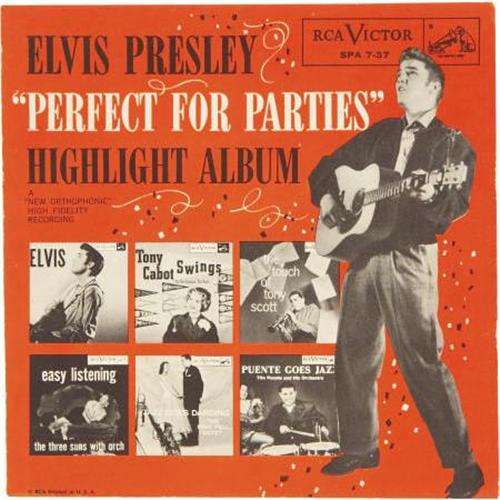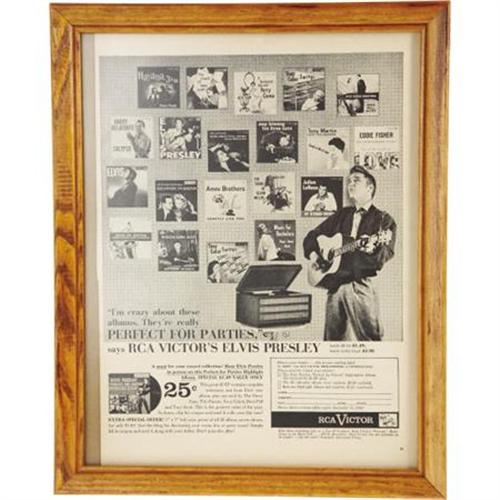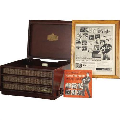 <B>Elvis Presley Model 7HF-45 Record Player and More (1956).</B></I> RCA cornered the market on record players designed solely for playing the standard 7" 45 rpm record, and this sporty model was one of the coolest. It's memorialized in an ad for Elvis and other RCA artists of the day, and we're offering a framed copy of the ad with the phonograph. The player, in handsome cherry wood, is in exceptional condition and still works! But there's more! Also shown in the ad and included here is a stone MT 9/ MT 9 copy of the sampler "Perfect For Parties" EP, issued with an Elvis-dominated paper sleeve and only as a promotional mail-order. Quite a spiffy little set for your entertainment room!<BR><BR><b>Shipping:</b> Miscellaneous Collectibles, Larg (<a target="_blank" href="http://www.heritageauctions.com/common/shipping.php">view shipping information</a>)