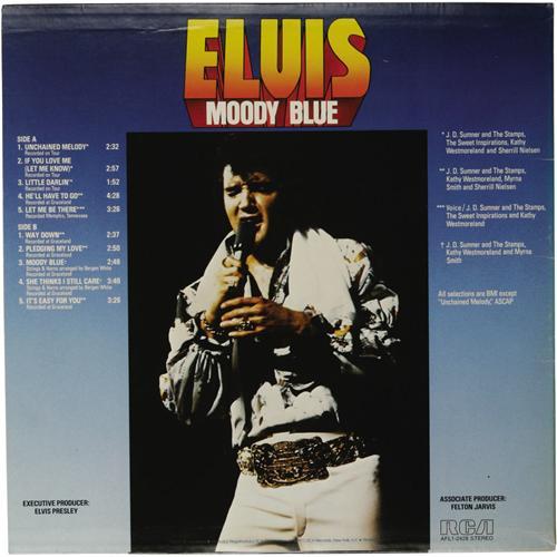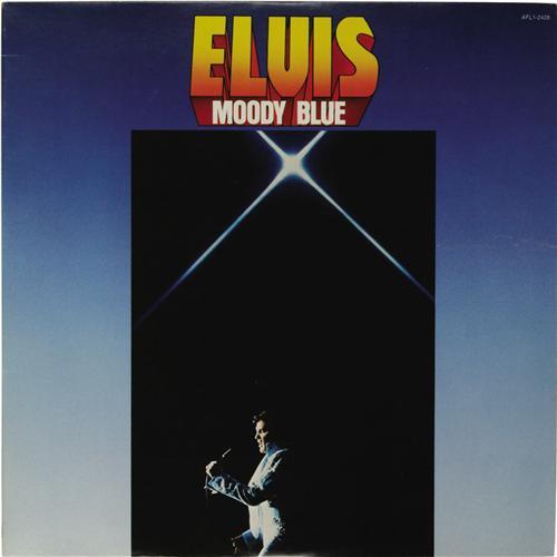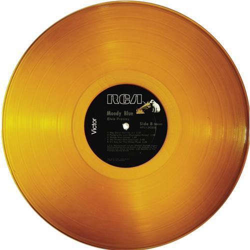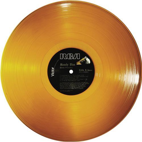 <B>Elvis Presley "Moody Blue" Gold Vinyl LP RCA AFL 1-2428 Stereo (1977).</B></I> Released the year Elvis died, any color version other than the black and the blue ones was produced in very limited numbers, and intended for RCA in-house use only. But this one could go to <I>your</B></I> house! Condition: NM 8/ NM 8. <I>From the GRT Collection</B></I>.