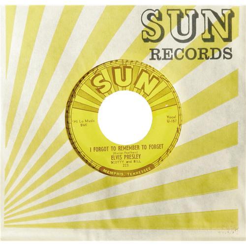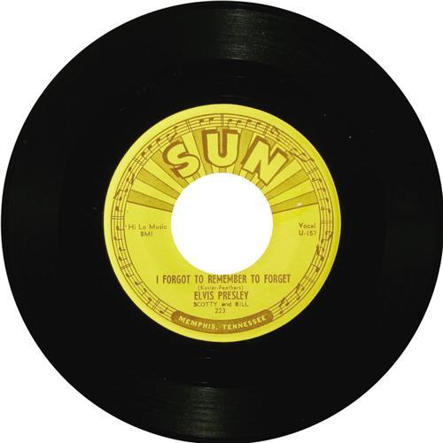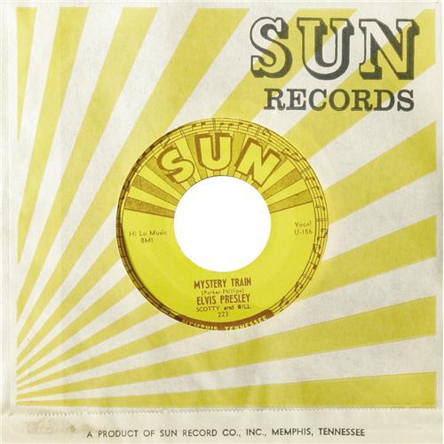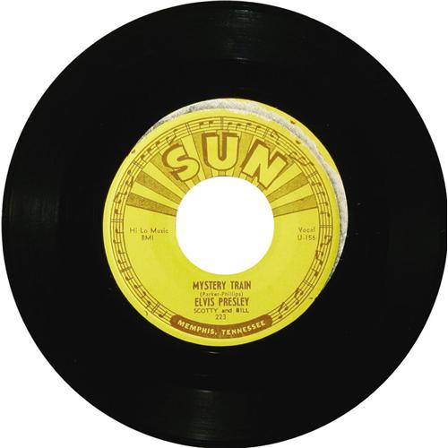 <B>Elvis Presley "Mystery Train"/ "I Forgot To Remember" 45 Sun 223 (1955).</B></I> Elvis' final Sun release was his most successful, a double-sided classic. "Mystery Train" generally gets the accolades today, but in 1955 "I Forgot To Remember To Forget" became The King's first #1 hit -- on Billboard's Country charts -- while "Mystery Train" peaked at #11. It appears the "Mystery Train" side's label was initially mispressed and nearly completed removed before the correct label was pressed on. This nice copy actually plays better (NM 8) than it looks! Condition: EX 7.