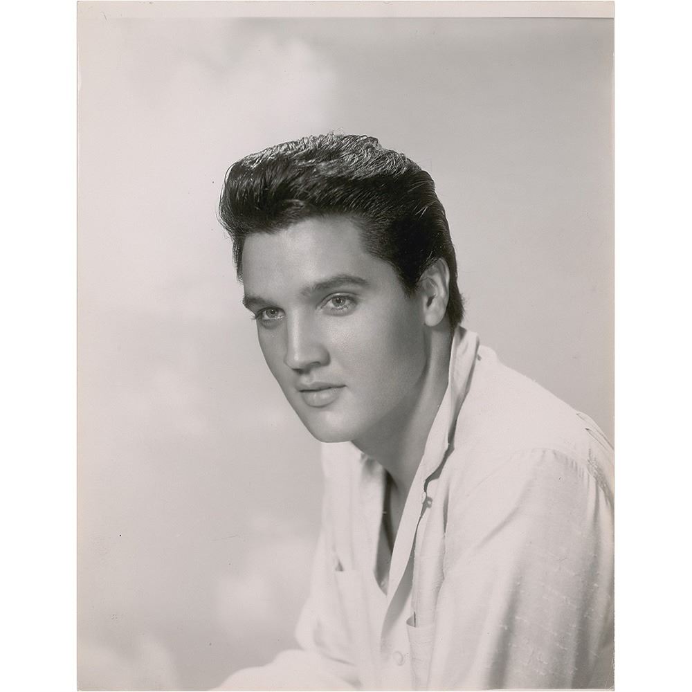 Crystal-clear original vintage glossy 7.5 x 9.5 silver gelatin photo of Elvis showing off his iconic slicked-back pompadour. Reverse is stamp-dated August 21, 1961, and bears a "Hollywood Press Syndicate" credit stamp. In fine condition, with trimmed edges and mild surface creases. From the Globe Photo archives.