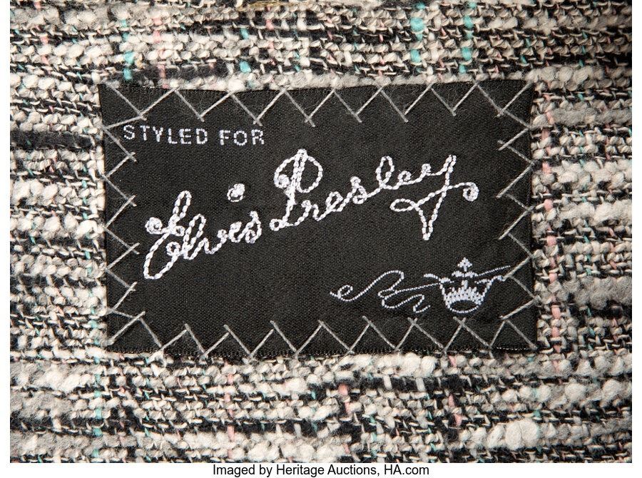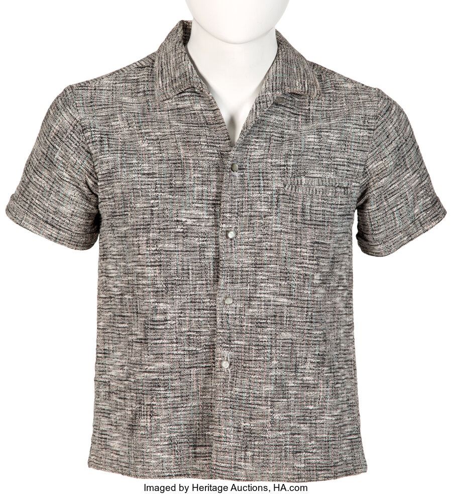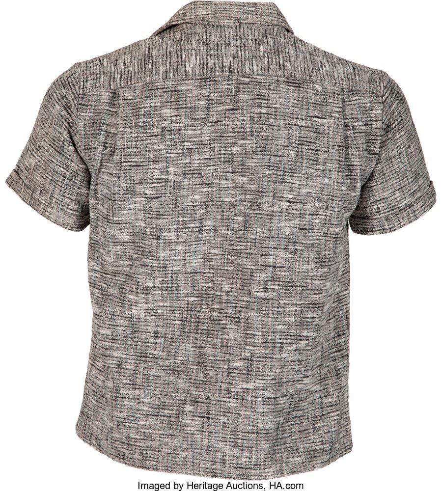 Elvis Presley Owned and Worn Custom Made Woven Shirt With Wood Hanger Signed by Bernard Lansky. Two items are in this lot. Includes: 1)A button-down, short sleeve 1950s shirt owned and worn by the King. In black and white, woven. Has "Styled For / Elvis Presley" tag stitched on the interior. Measures 18" from armpit to armpit, 21 ½" from the front collar to the bottom, and 8" sleeve. Comes with a signed LOP from Alan Fortas, a lifelong friend of Elvis who was a foreman at the Circle G ranch, was an extra in many of his films, and was in the round segment during the 1968 comeback special. In Very Good Plus condition with some loose threads in the back portion; 2)A black Lansky Brothers hanger signed (and inscribed "Clothier to the King" with the date) with a silver felt tip by Bernard Lansky. In Very Good Plus condition with some chipping on the ends. COA from Heritage Auctions.