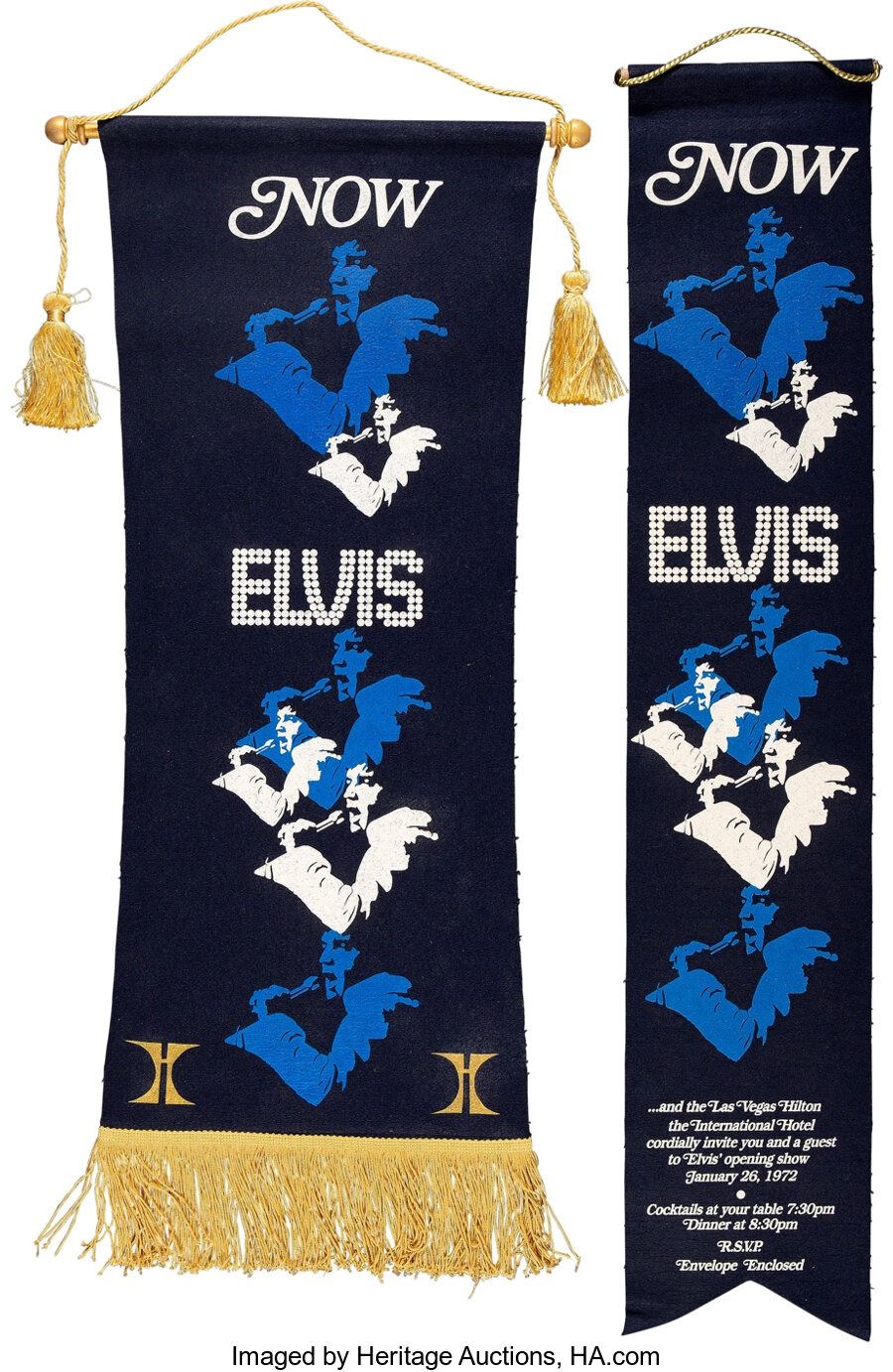 Elvis Presley Pennants (2). Two blue pennants featuring the King at the Hilton in Las Vegas. One has tassels and measures 10 ½" x 31". The other measures 6 ¾" x 34". The smaller one includes an invitation to the opening show on January 26, 1972. In Very Good Plus condition with overall wear on them. COA from Heritage Auctions.