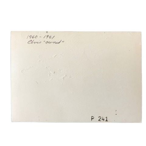 A photo of Elvis Presley’s Tennesee mansion, Graceland. The photo bears an unknown inscription on the back--although it resembles Presley’s handwriting--reading “1960 - 1961” and beneath the dates listed, a curious note, “Elvis “owned”, possibly a satirical remark, since Graceland, meant to be a retreat from the world, was always wildly busy with fans, family and friends, and even Presley’s pet chimpanzee, and its staff, hospitality and upkeep kept Presley busy performing. Presley cherished this photo of his beloved home and kept it with his personal effects at Graceland for many years.