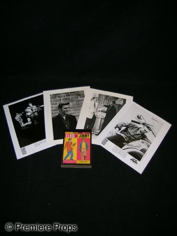 From the Lester Glassner Collection. This is a lot of (4) Elvis Presley black and white photos and (1) color postcard. Two photos depicts Elvis, possibly appearing on a television show, as he stands next to a jukebox talking to the host, and medium shot of him flashing that trademark smile. The two other B&W photos are from the 1987 video release 'Elvis '56' by Media Home Entertainment. The color postcard depicts a 'double feature' image of Elvis and actor James Dean (measures approx. 4" x 5 1/2") The B&W photos measure approx. 8" x 10" each. Lester Glassner was a collector of Pop culture artifacts whose collection included movie posters, lobby cards, toys, and more than 250,000 movie stills.
