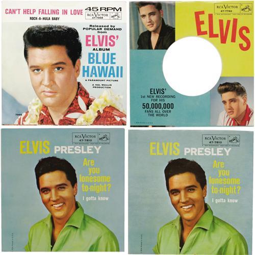 <B>Elvis Presley Picture Sleeve Group of 10 (RCA, 1959-62).</B></I> Beautiful collection of picture sleeves, all in NM 8, unless noted: "A Big Hunk O' Love" (RCA 7600, 1959) in MT 9; "Stuck On You" (RCA 7740, 1960); "It's Now Or Never" (RCA 7777, 1960) in MT 9; two copies of "Are You Lonesome Tonight?" (RCA 7810, 1960), one in NM 8 and one in MT 9; "Devil In Disguise" (RCA 8188, 1960) in GM-MT 10; "Surrender" (RCA 7850, 1961) in MT 9; "Little Sister"/ "His Latest Flame" (RCA 7908, 1961); "Can't Help Falling In Love" (RCA 7968, 1961); and "Good Luck Charm" (RCA 7992, 1962). <I>From the GRT Collection</B></I>.<BR><BR><b>Shipping:</b> Recordings (<a target="_blank" href="http://www.heritageauctions.com/common/shipping.php">view shipping information</a>)