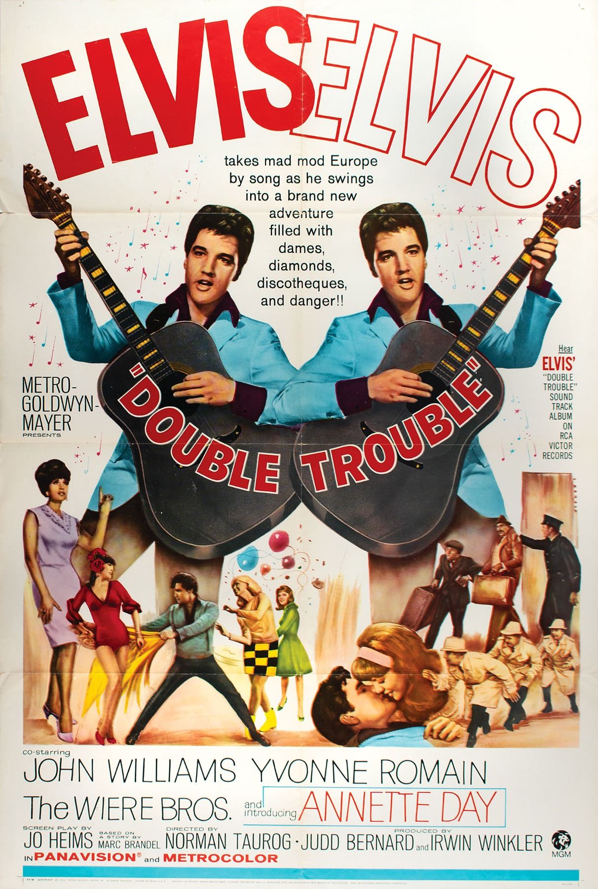 (MGM, 1967) Original color 27 x 41 one sheet movie poster for Double Trouble, starring Elvis Presley in a comedy about an American singer who crosses paths with criminals in Europe. In fine condition, with folds as issued.