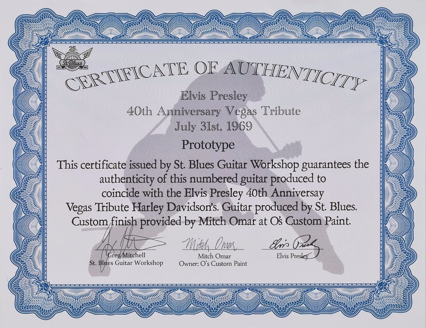 Custom red sparkle Telecaster-style ‘Mississippi Bluesmaster’ prototype guitar made by St. Blues Guitar Workshop for Southern Thunder Harley-Davidson and Elvis Presley Enterprises to commemorate the 40th anniversary of Elvis Presley’s 1969 return to live performances in Las Vegas. St. Blues built five guitars with identical graphics to be sold with a limited edition Harley-Davidson motorcycle in 2009, with all graphics on the motorcycles and the guitars custom painted by O's Custom Paint. This particular guitar is one of the three prototypes created. Includes an Elvis Presley guitar pick and a handsome hemp-covered carrying case from St. Blues Guitar Workshop of Memphis, Tennessee. In fine condition. Accompanied by a certificate of authenticity from St. Blues.