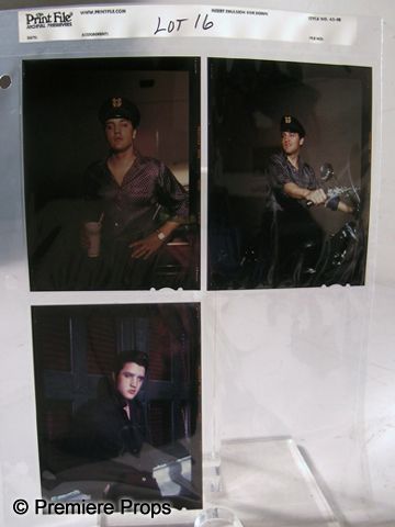 An amazing collection of photographic ephemera from the King of Rock n' Roll himself, Elvis Presley. With the 35th Anniversary of his passing recently commemorated, this is a wonderful lot of slides, negatives and transparencies chronicling the career of one of the greatest entertainers in history. Formerly on display in the Mississippi Music Hall of Fame, most of these images have never been seen, much less made available to the public before, and Premiere Props is proud to be able to offer these incredible, historical lots. This is a lot of (3) large size color transparencies featuring two images of Elvis sitting atop a motorcycle, wearing a 50's style leather 'biker' cap (possibly from the filming of Jailhouse Rock), and an image of Elvis in a blue striped shirt, leaning against a window with the look that melted so many hearts. Simply amazing that these have been unseen by the public for all these years. Until now....(measures approx. 4"x 5" ea.)