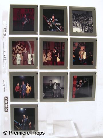 An amazing collection of photographic ephemera from the King of Rock n' Roll himself, Elvis Presley. With the 35th Anniversary of his passing recently commemorated, this is a wonderful lot of slides, negatives and transparencies chronicling the career of one of the greatest entertainers in history. Formerly on display in the Mississippi Music Hall of Fame, most of these images have never been seen, much less made available to the public before, and Premiere Props is proud to be able to offer these incredible, historical lots. This is a lot of (10) large size, color and b&w slides. They include: eight behind-the-scenes color images of Elvis singing, playing guitar, and performing on stage from different productions, and two b&w images of Elvis in a leather outfit; one playing guitar in front of an audience, and another with him sitting on a couch with his arm around a young boy. Simply amazing that these have been unseen by the public for all these years. Until now...(slides measure approx. 2 3/4"x 2 3/4" ea.)