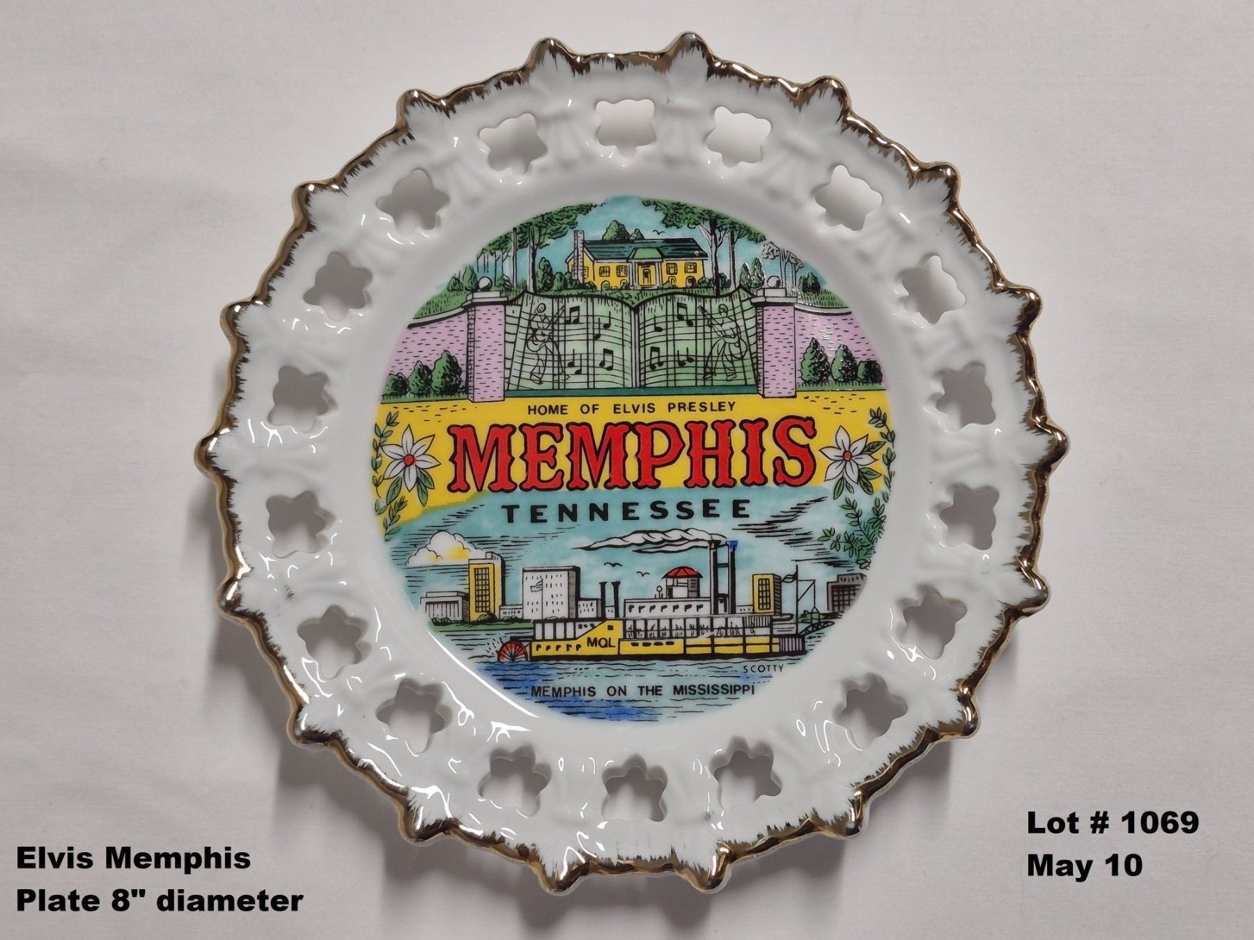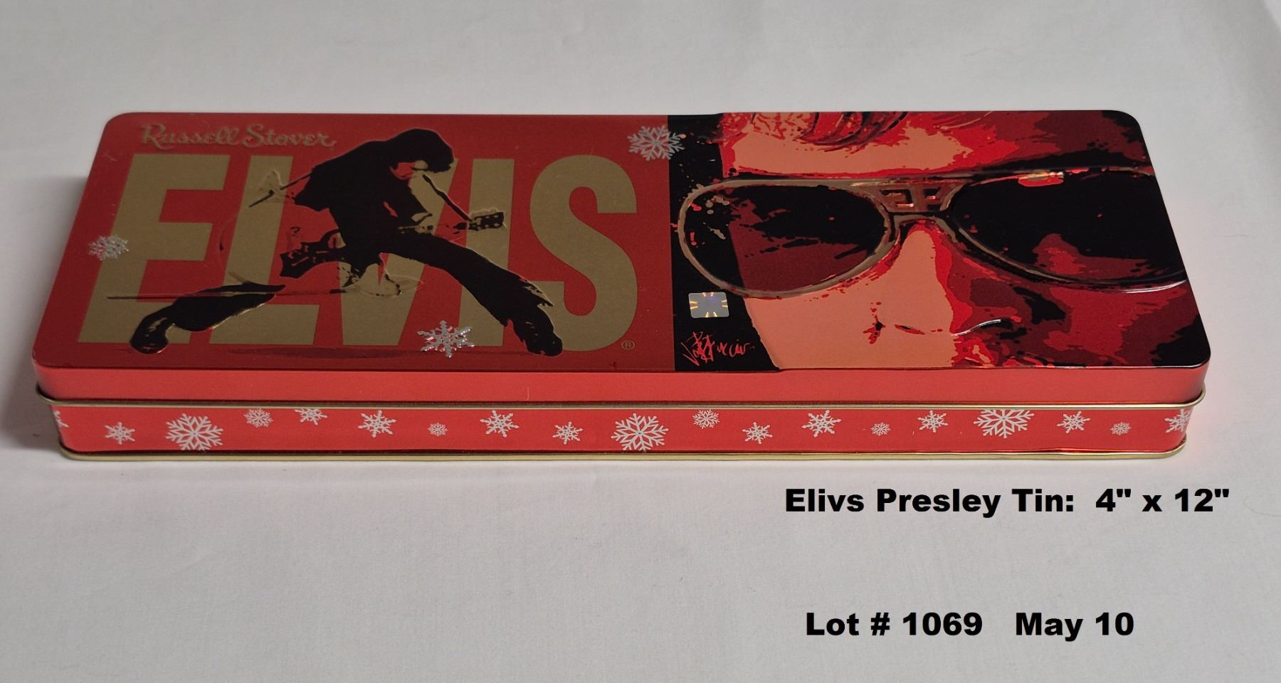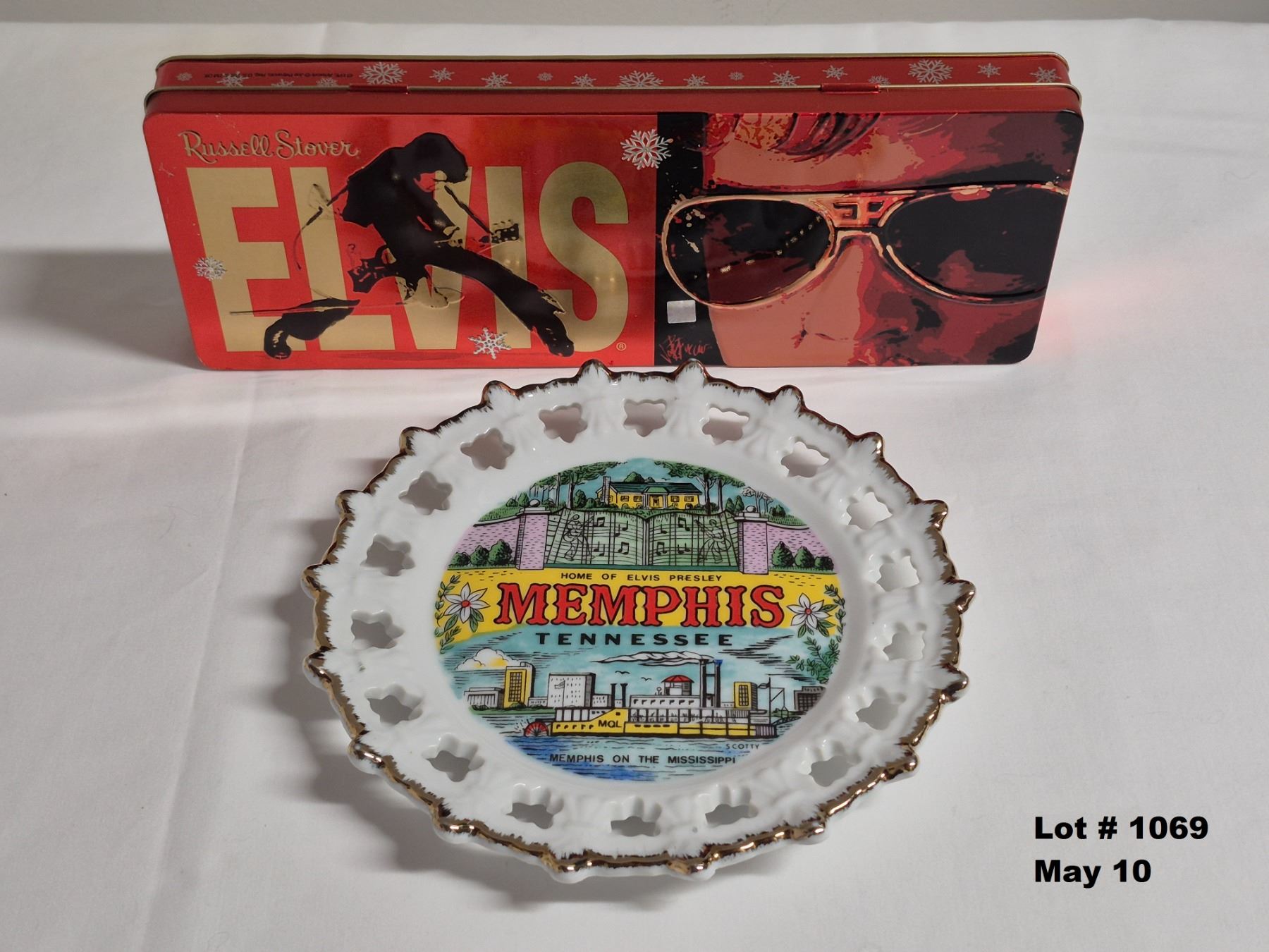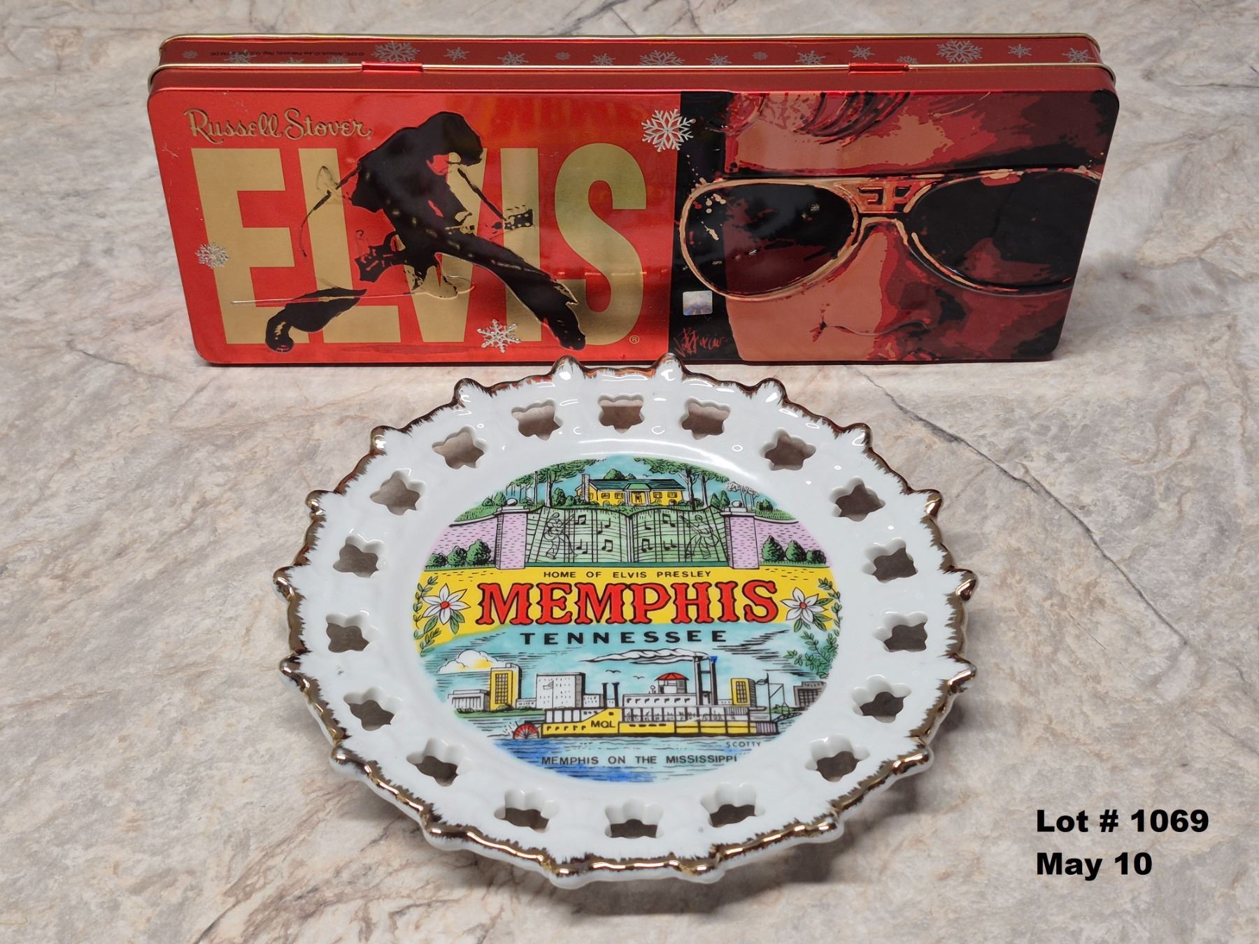 Elvis Presley Russell Stover Collector Tin and Vintage Memphis "Home of Elvis" Collector Plate with Gold Scalloped Edge