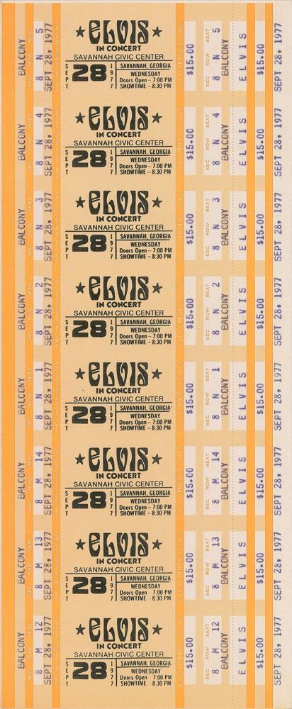 Unperforated sheet of yellow “Elvis in Concert” tickets, 5.5 x 13.25, consisting of eight tickets for an Elvis Presley show at the Savannah Civic Center in Savannah, Georgia, on September 28, 1977, with a showtime of 8:30 p.m. Each ticket is typed “ELVIS,” and issued for Balcony section 8 (Row M, seats 12-14; Row N, seats 1-5). In fine condition. The concert ultimately never took place as Presley passed away on August 16, 1977, at the age of 42.