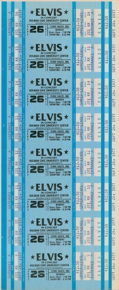 Unperforated sheet of blue “Elvis in Concert” tickets, 5.5 x 13.25, consisting of eight tickets for an Elvis Presley show at the Hulman Civic University Center at Indiana State University on September 26, 1977, with a showtime of 8:30 p.m. Each ticket is typed “ELVIS,” and issued for Entrance A section 201 (Row KK, seats 9-16). In fine condition. The concert ultimately never took place as Presley passed away on August 16, 1977, at the age of 42.