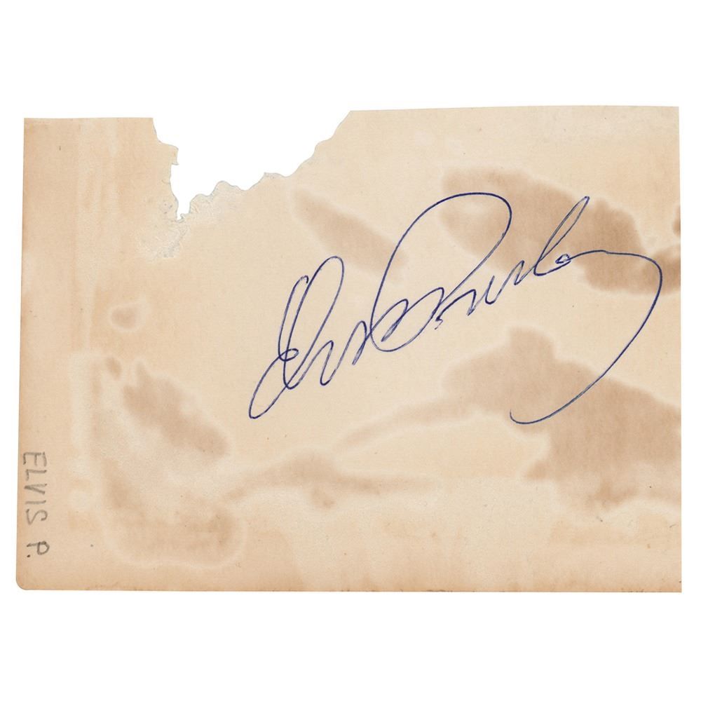 Vintage ballpoint signature, "Elvis Presley,†on an off-white 5.25 x 4 album page. In very good condition, with paper loss to the top edge, and staining affecting appearance.