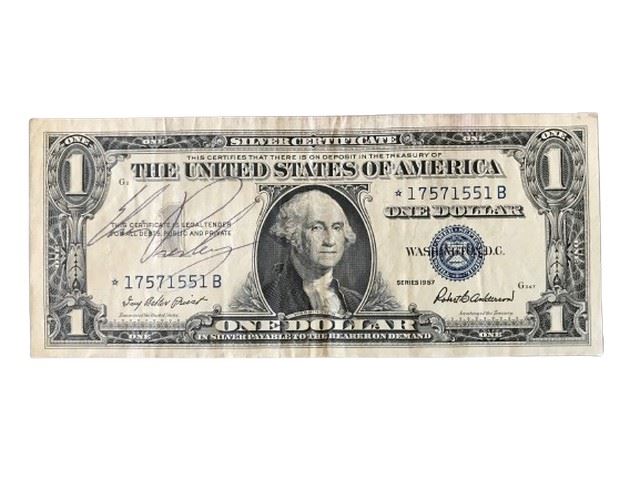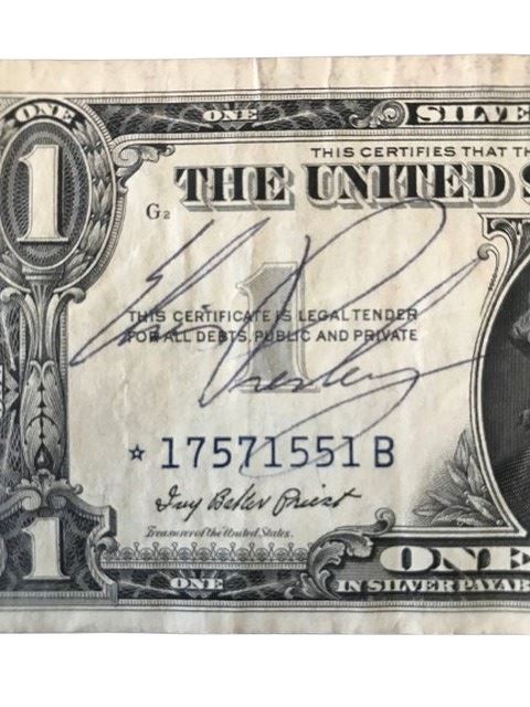 A 1957 One-Dollar US bill signed by Elvis Presley, given to his good friend Bill Yates. Yates, an early Sun Records artist, recorded hits at Sun including, “Don’t Step on My Dog,” a reworking and “reply song” to Rufus Thomas’s funky “Walkin The Dog”, and “You Better Stop, Wait and Listen”. Yates was Presley’s first pianist and backed Presley and Patsy Cline among others during his career. His Memphis work with Presley led to work in Presley’s entourage as his bodyguard, starting in 1961. Presley signed this bill for Yates in 1957, soon after he'd shot to meteoric fame the year before at age 21, including acclaimed performances on the Ed Sullivan Show. This bill remained in Yates’s collection for many decades.