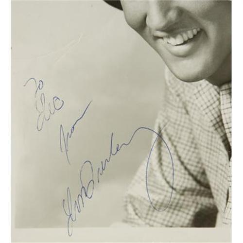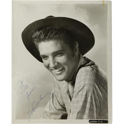 <B>Elvis Presley Signed Photo.</B></I> A b&w 8" x 10" photo of Elvis in his late 1950s era, in cowboy hat and rustic shirt, leaning into the photographer and flashing a smile, and signed in blue point, "To Lee from Elvis Presley." The picture has some surface creasing and a small stain in the upper right margin, slightly extending into the picture but two inches from Elvis' image. Very Good condition. <I>Accompanied by a COA from PSA/DNA.</B></I><BR><BR><b>Shipping:</b> Flat Material, Small (<a target="_blank" href="http://www.heritageauctions.com/common/shipping.php">view shipping information</a>)