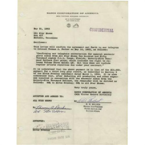 <B>Elvis Presley Signed Agreement (1963).</B></I> Elvis signed this "CONFIDENTIAL" agreement between RCA and All Star Shows that related to The King's third Golden Records collection ("Elvis' Golden Records", Volume 3 - RCA LPM-2765, 1963). In Excellent condition. <I>Accompanied by LOA from PSA/DNA.</B></I><BR><BR><b>Shipping:</b> Flat Material, Small (<a target="_blank" href="http://www.heritageauctions.com/common/shipping.php">view shipping information</a>)